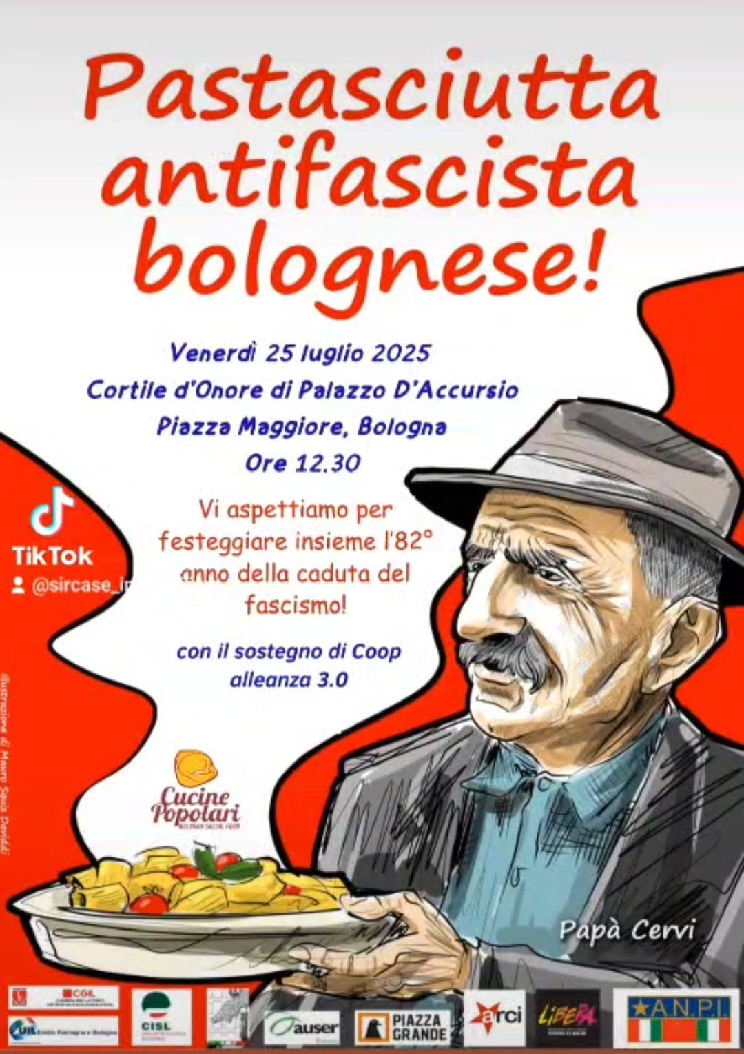 Anche quest’anno si è festeggiata la caduta del fascismo il 25 luglio con una pastasciutta antifascista. Sono stati tanti i pasti, preparati da volontarie e volontari di Cucine popolari, serviti nel cortile d’onore di Palazzo d’Accursio, Piazza Maggiore. Tanto buon cibo, tanta partecipazione antifascista. Come noto, il 25 luglio 1943 Benito Mussolini venne destituito e arrestato, per festeggiare la caduta del regime la famiglia Cervi servì pastasciutta a tutto il paese di Compegine. E ogni anno, in tutta Italia, e noi lo facciamo a Bologna, si ripete il festeggiamento.