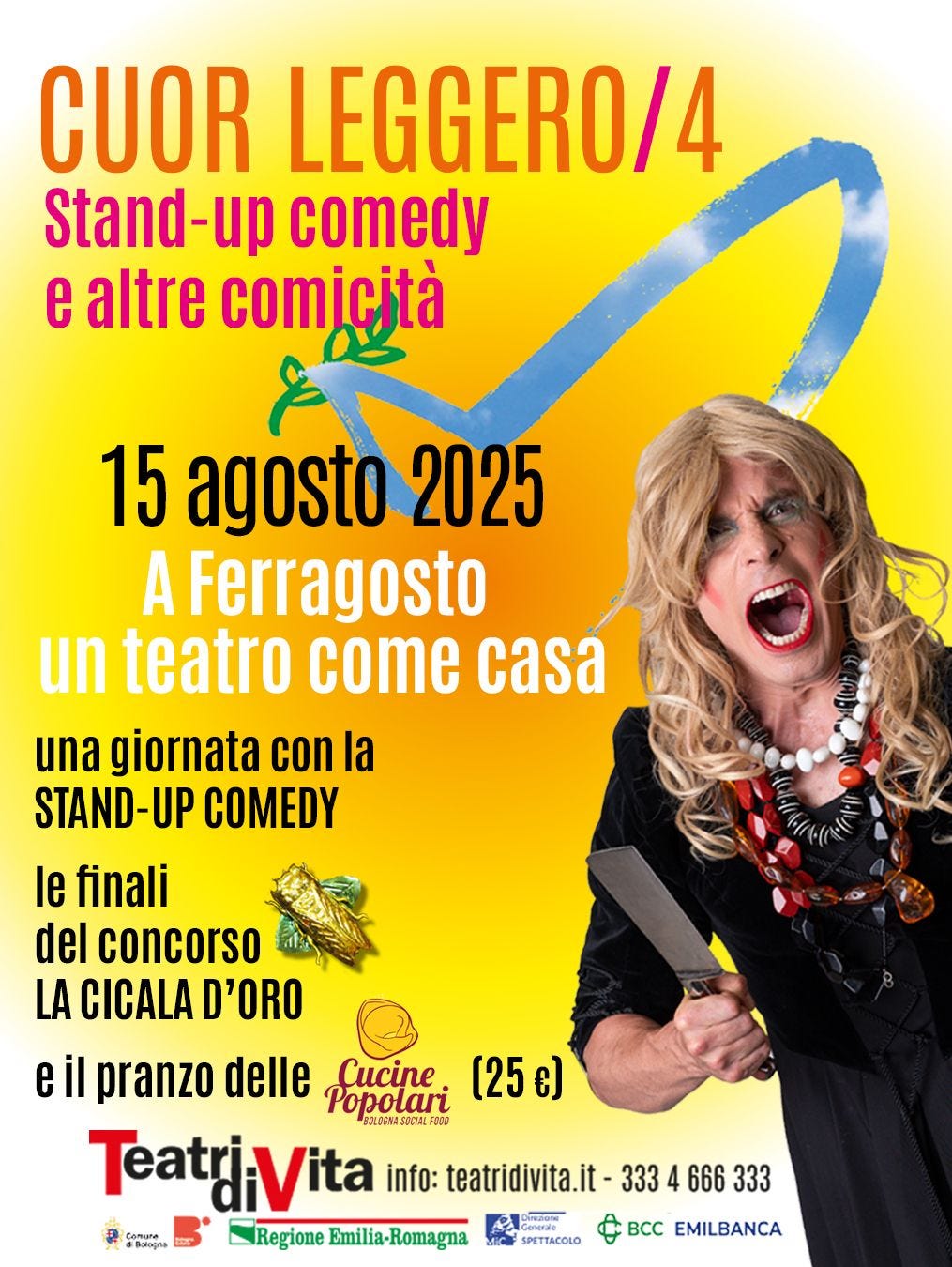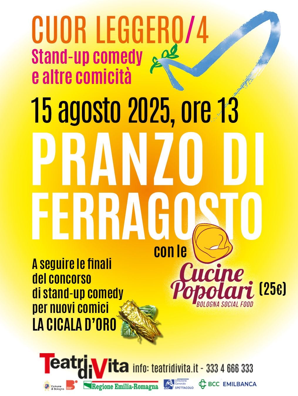 Anche quest’anno ritorna un appuntamento importante al quale invitiamo tutte e tutti: il pranzo, preparato da volontarie e volontari di Cucine popolari che anche in questo giorno di festa offrono il loro tempo e il loro lavoro volontario gratuito, è a Teatri di vita, a Borgo Panigale, in via Emilia Ponente 485, sotto il fresco degli alberi. Andrea Adriatico e Stefano Casi, che dirigono il teatro, sono nostri cari amici e anche questo ferragosto lo passeremo insieme. Il pranzo sarà alle 13. Il costo è di 25 euro. Per info: teatridivita.it e 333466633
