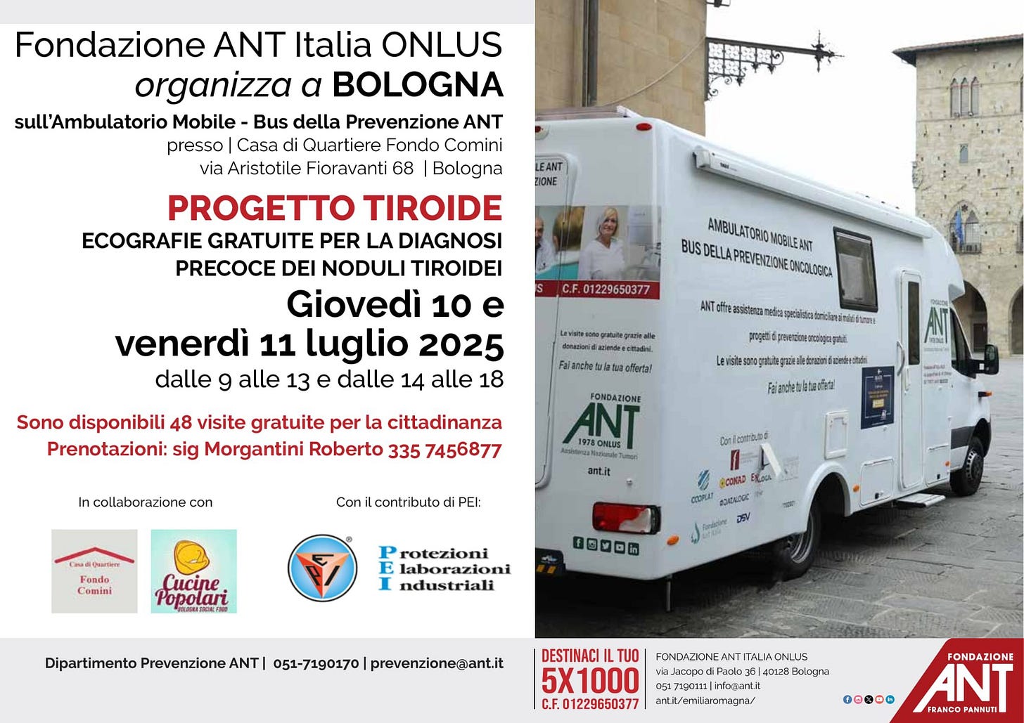 Cucine popolari, Fondazione Ant, e PEI (Protezione Elaborazioni industriali) hanno organizzato due giornate di prevenzione del tumore della tiroide con visite in un ambulatorio mobile proprio di fronte a Cucina popolare Battiferro e al Fondo Comini.